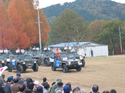 本日は京都府福知山市にあります、陸上自衛隊第七普通科連隊・福知山駐屯地に行って来ました。秋の山々が歓迎してくれましてとても気分よくドライブ気分でお伺いしてきました。当日はイラクをはじめ、PKOや昨年騒がれました鳥インフルエンザなどの駆除などに出動されました皆さんの紹介がありました。昼からは懇親会などを行なわれ、駐屯地司令・ひげの隊長さんのニックネームでもあります、佐藤一等陸佐にお願いをしました一枚の写真です。